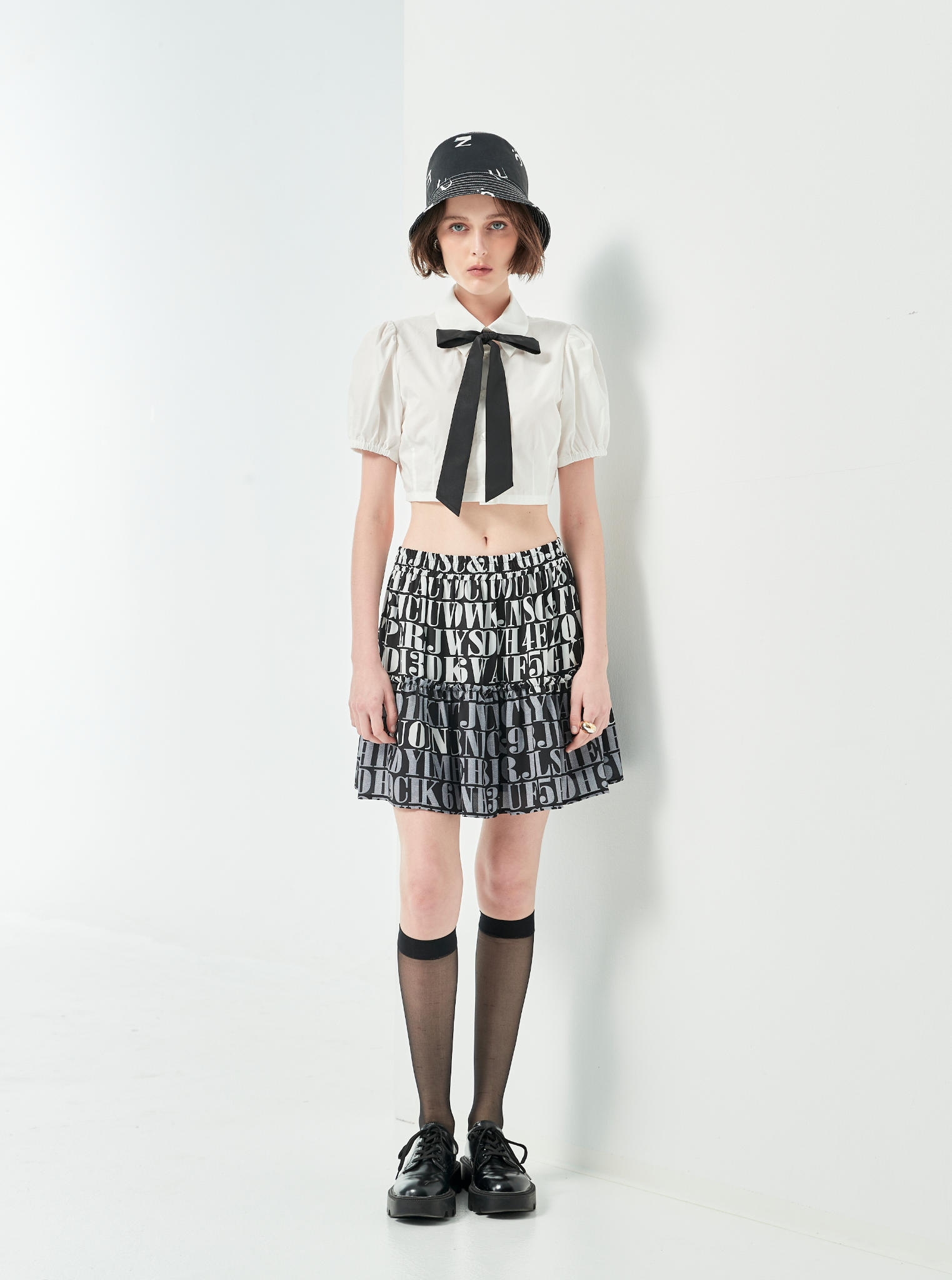 Nơ đen bản lớn được buộc ngay dưới cổ áo – là điểm nhấn mang đậm chất "school-girl" ngọt ngào, phá cách.