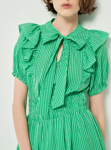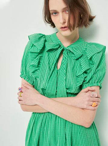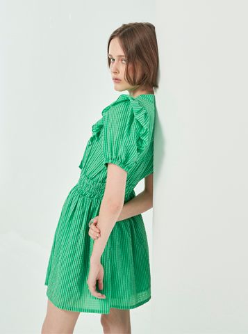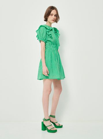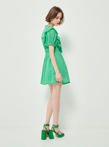 Đầm hồng caro có dây thắt nơ ở cổ, nhún bèo ở hai bên vai dáng xòe bồng bềnh, nhẹ nhàng và cá tính cho nữ